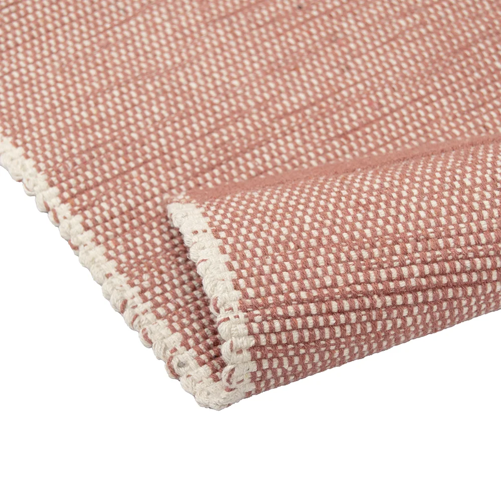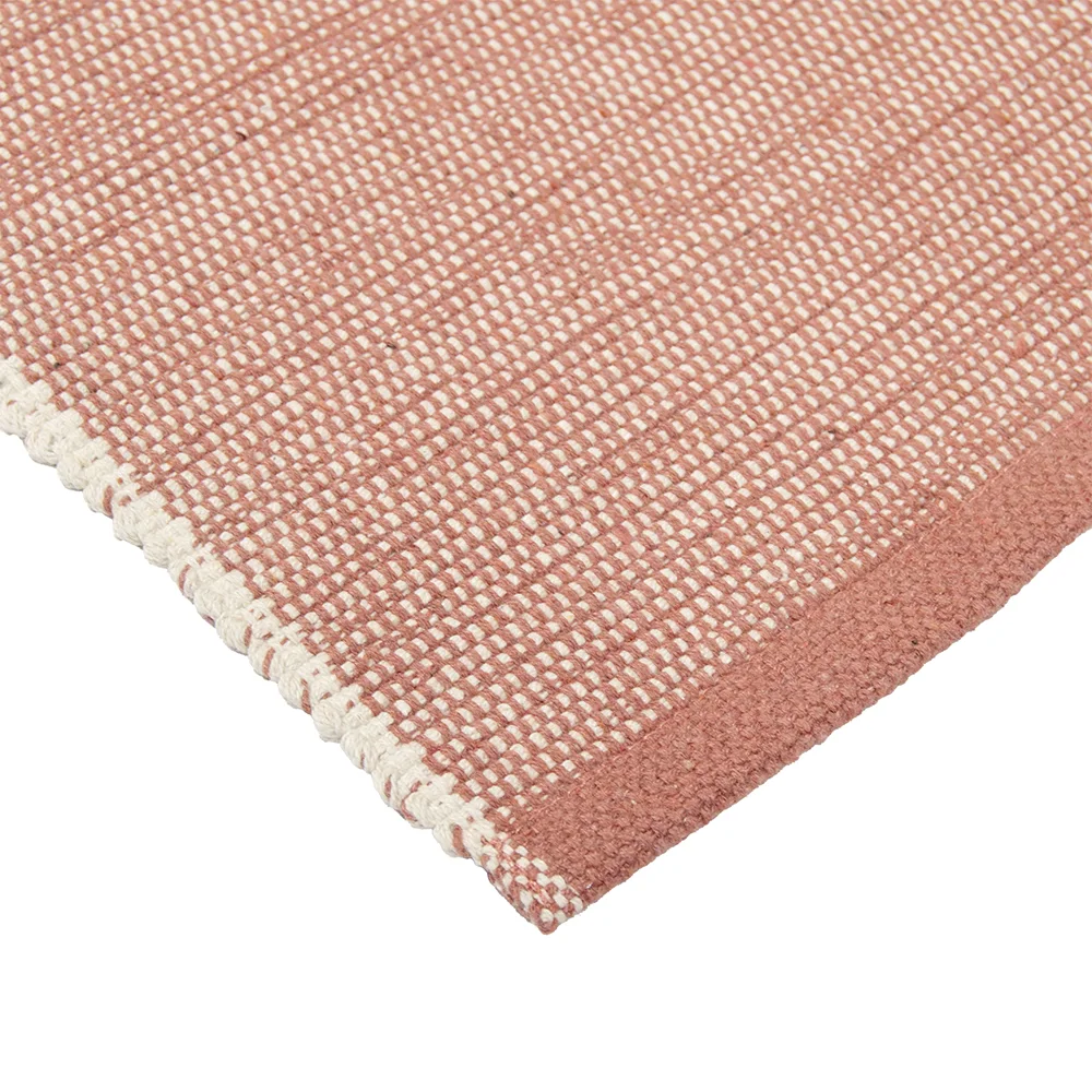 Puuvillamatto on kodin perusmatto, joka sopii lähes kaikkiin kodin tiloihin. Matto on erinomainen valinta myös mökille. Matossa on kaunis roosa sävy, joka on helppo yhdistää kodin muuhun sisustukseen. Valkoinen raikastaa ja keventää maton ilmettä. Maton päissä on kapeat käännetyt kantit, jotka antaa matolle modernin ja pelkistetyn ilmeen.